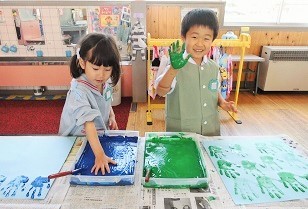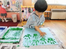 青と緑の絵の具で手形を押し、こいのぼりのうろこに見立てます。