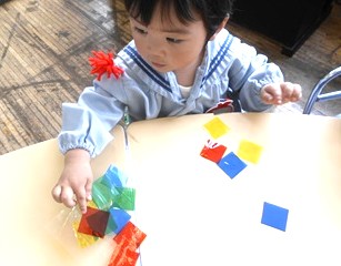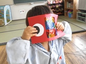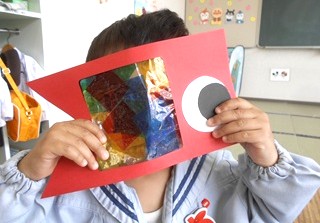 透明なシートに色付きセロハンをつけてこいのぼりのうろこを表現して