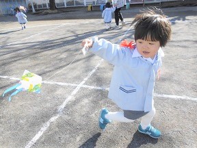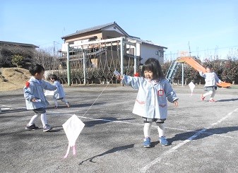 たこを持ってお庭を走る子供たち。
