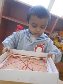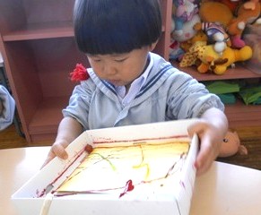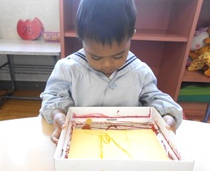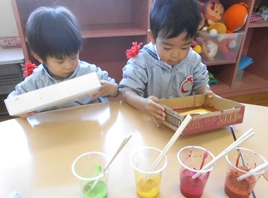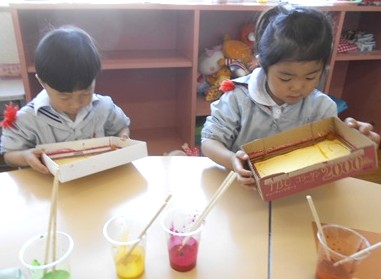 春への期待を膨らませながら、つぼみ組さんが絵の具を使った楽しいせいさくにチャレンジです。