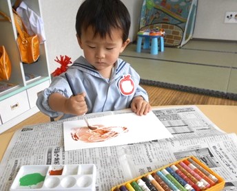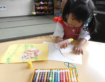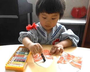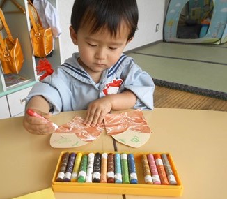 クレヨンで書いた模様の上を絵の具ではじきます。
