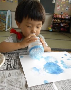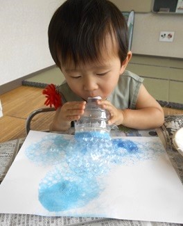ブクブクと絵の具を吹きながら、画用紙に模様をつけていきます。