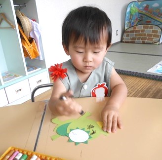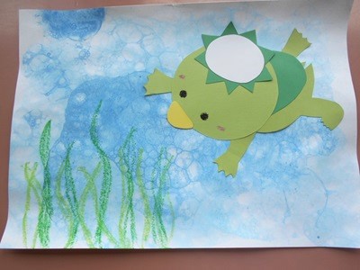 画用紙にきれいな泡の模様がついたら、泳ぎの得意なかっぱさんを作ります。
