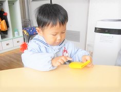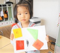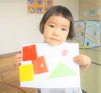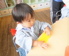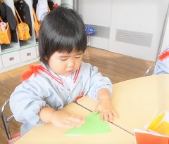 今日は、2歳児つぼみ組さんが折り紙を折りました。