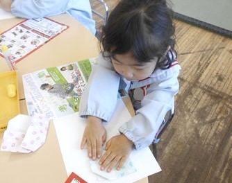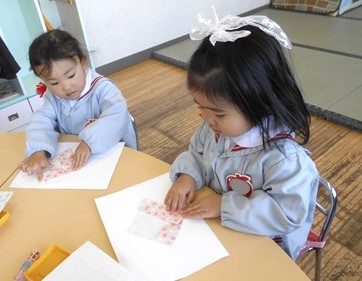 つぼみ組さんが季節にちなんで「おひなさま」の折り紙を折りました。