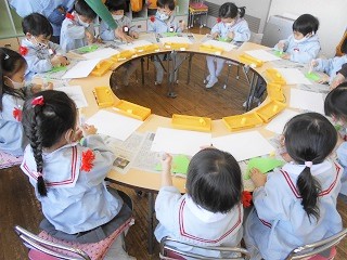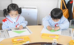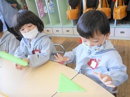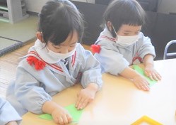 小さなクラスのつぼみ組さんが、折り紙でお山を作りました。