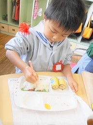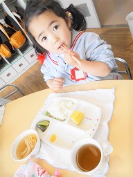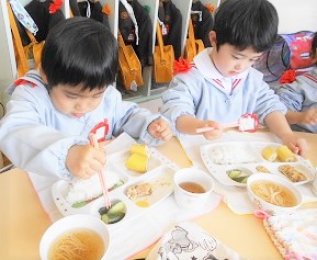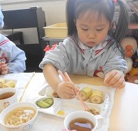 幼稚園では少しずつお箸の練習し、食事をしています。