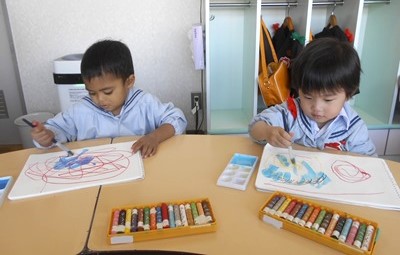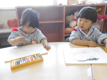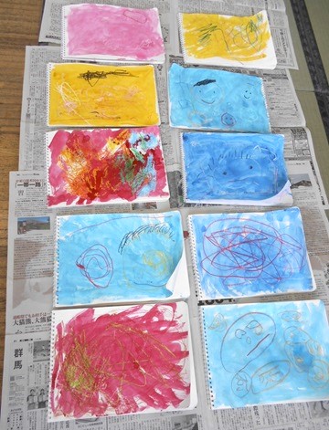 お絵描き帳にクレヨンで好きな絵を描いてから、はじき絵に挑戦!!