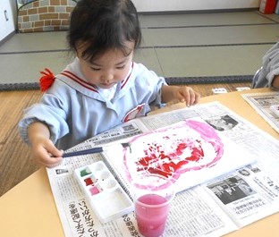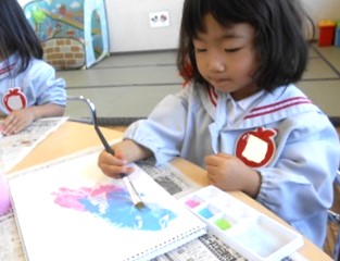 今日は、つぼみ組さんが絵の具遊びで「はじき絵」を行いました。