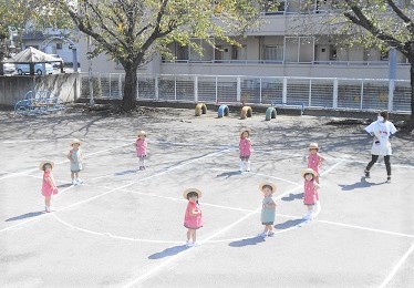 大きな園庭の真ん中で、小さな体をめいっぱい動かして踊ります。