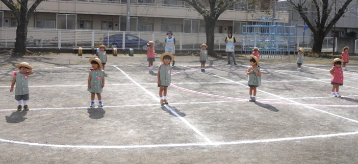 広い園庭に小さなクラスが並んで、お遊戯の隊形に広がりながら