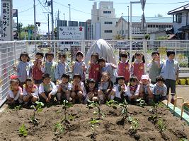 年長つきぐみさんが 畑に野菜の苗植えをしました!!