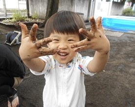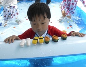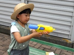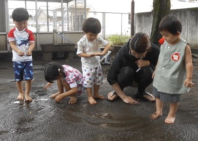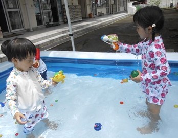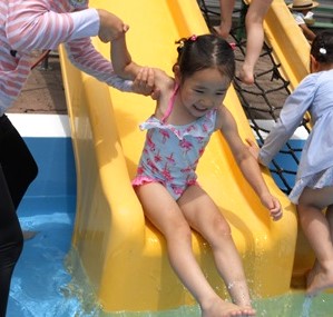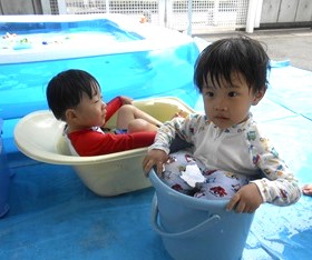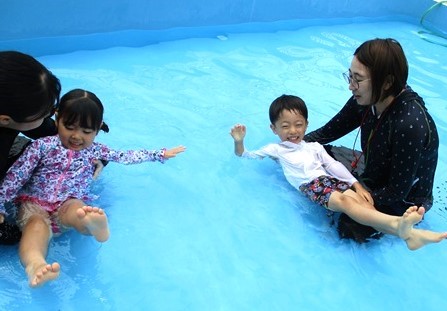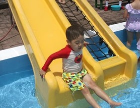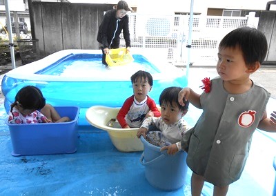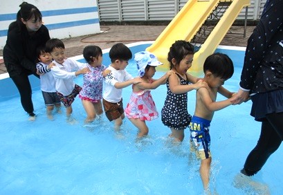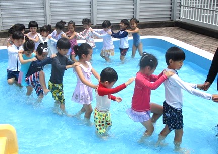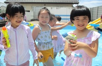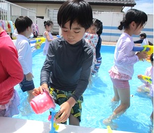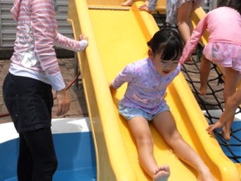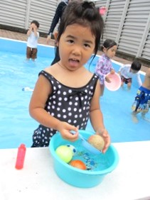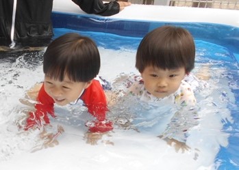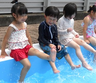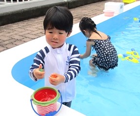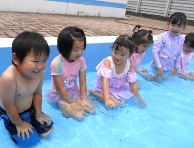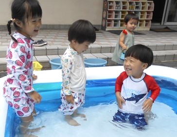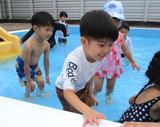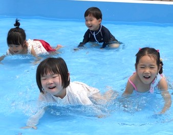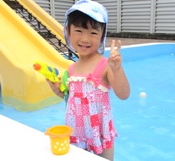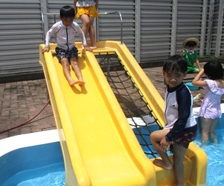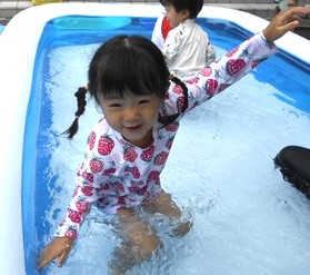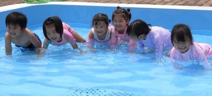 朝は雨でしたが、天気予報通り雨も上がりプールにみんなで入りました。