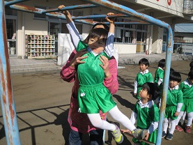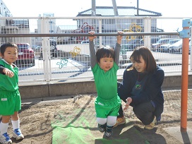 つぼみ組さんは《鉄棒のぶら下がり》をしました。みんなで10まで数えて筋肉ムキムキ!?
