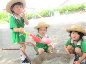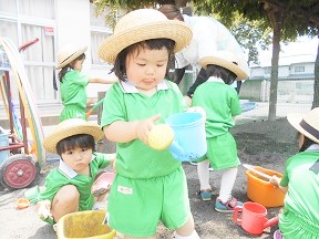 みんなで緑色の体操着に変身してお庭で遊びました。