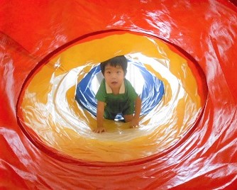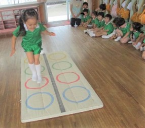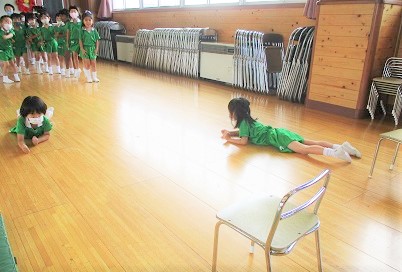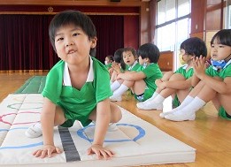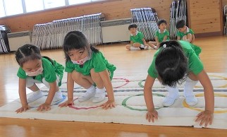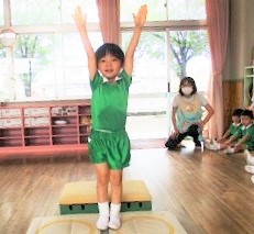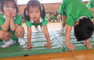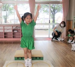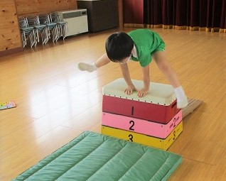 とび箱、マット、ジャンプ、トンネルなどを各クラスで楽しみました。