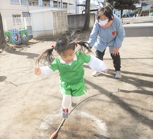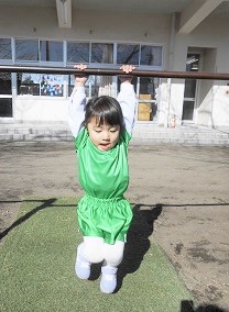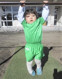 つぼみ組さんは、長縄跳びと鉄棒のぶら下がりの練習です。