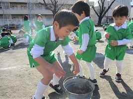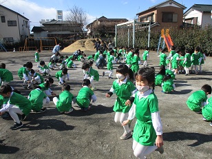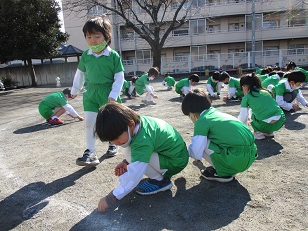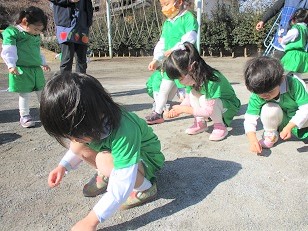 体操の後、昨日のお豆まきで園庭いっぱいに散らばったお豆たちを