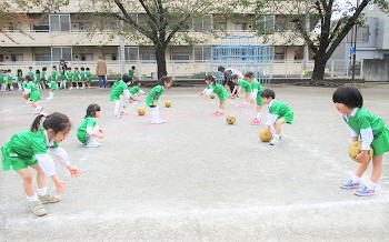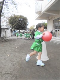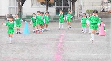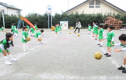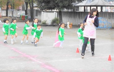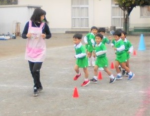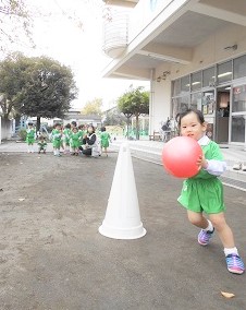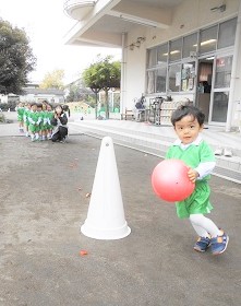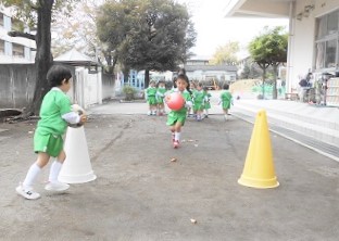 ボールをバトン替わりにしてコーンを回り、リレーをしました。