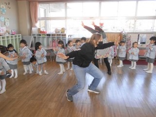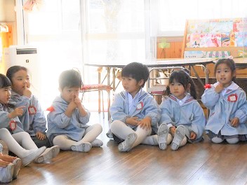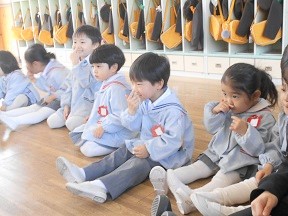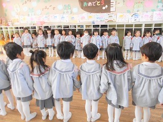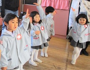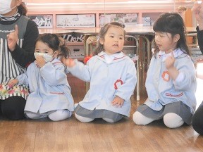 大きなクラスの友達を見ながら、進級や英語への期待を膨らませたつぼみ組さん。