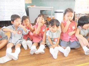 大きなクラスの友達を見ながら、進級や英語への期待を膨らませたつぼみ組さん。