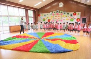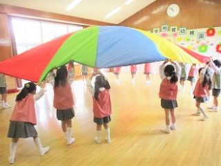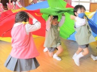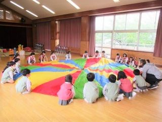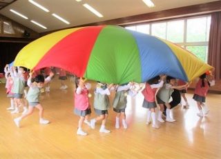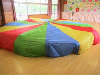 という事で、お遊戯室でプレイパラシュートをして遊びました。