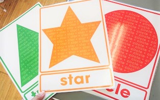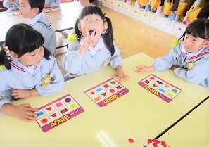 カードを英語で読み上げ、同じ色と形を探していきます。