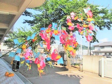 大きな笹にみんなで飾りをつけました。