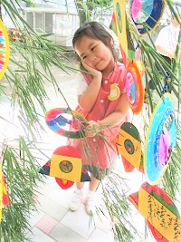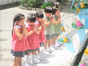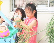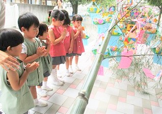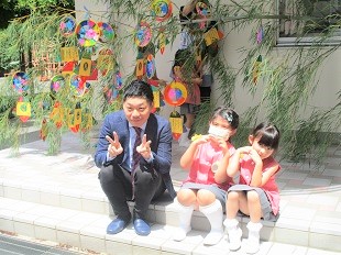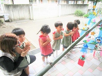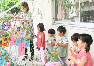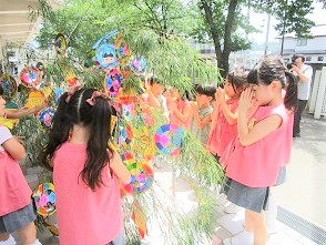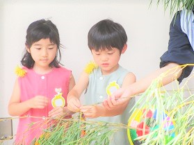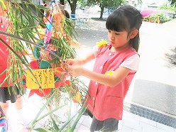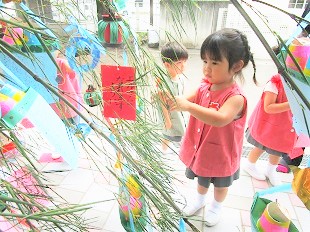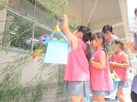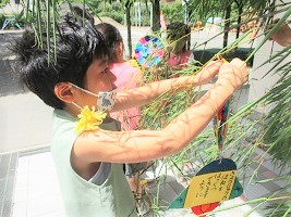 大きな笹に短冊をみんなで飾り、