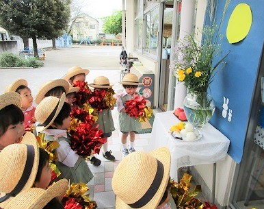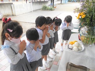 おいしそうなお団子と果物を目の前に、みんなで神様にお祈りをしました。