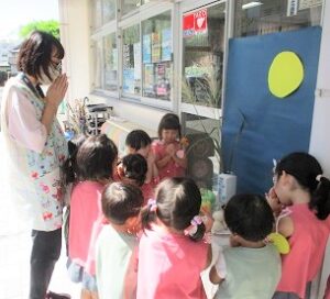 おいしそうなお団子と果物を目の前に、みんなで神様にお祈りをしました。