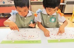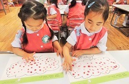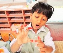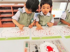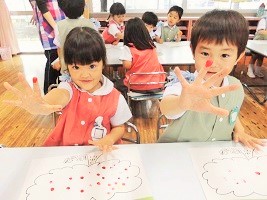 指先を使い赤い絵の具でトントントントン・・・