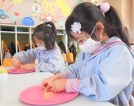 色とりどりのお盆に自分の顔をちぎり絵で作っていきます!