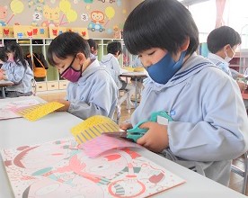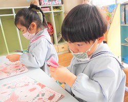 半分に折った色紙を線に沿って はさみで切っていきます。