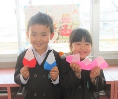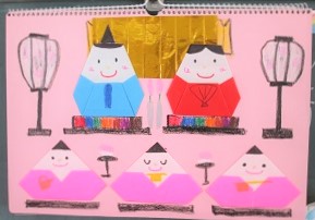 5枚の折り紙を使って、女雛・男雛・三人官女を折りました!