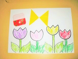 昨日、チューリップがたくさん咲いている画用紙に色を塗りました。
