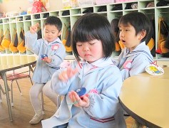 ♪ 雪のペンキやさん ♪ の曲に合わせてリズム打ちです。