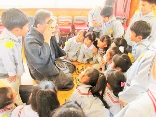 うわ~!! と面(おもて)の周りに集合した子供たち、