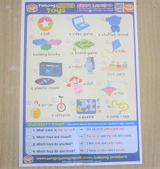 英語の先生の発音をよく聞き、プリントの中のおもちゃを当てます。