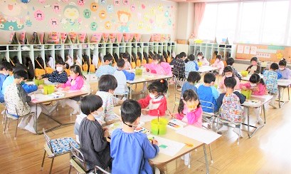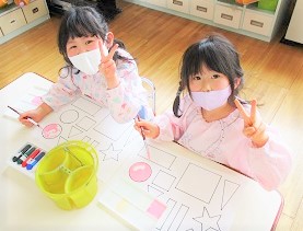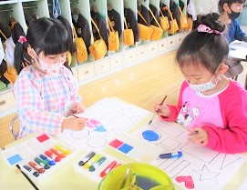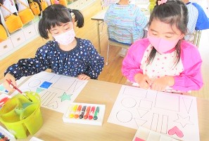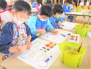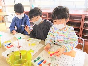 今日の月組さんは「構成あそび」という絵の具と製作帳の合体遊びを行いました。
