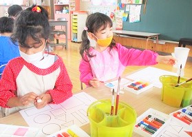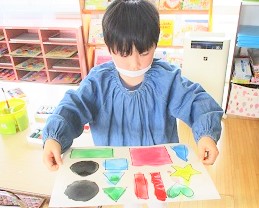 楽しかった絵の具あそびの続きは形を組み合わせて物語のある絵に仕上げていきます。