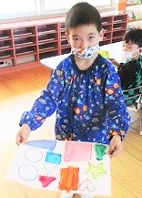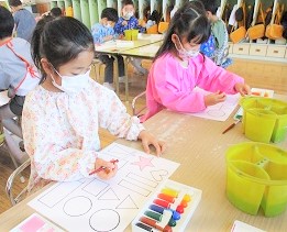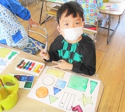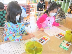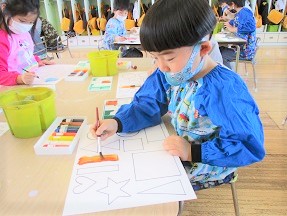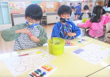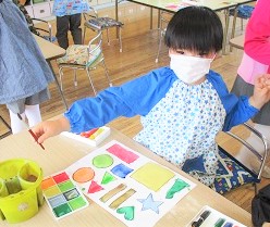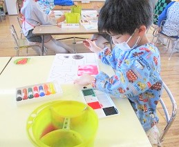 今日の月組さんは「構成あそび」という絵の具と製作帳の合体遊びを行いました。