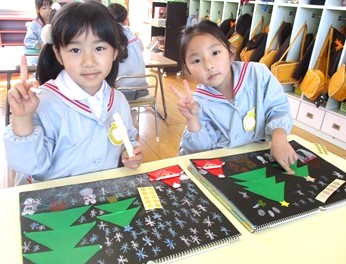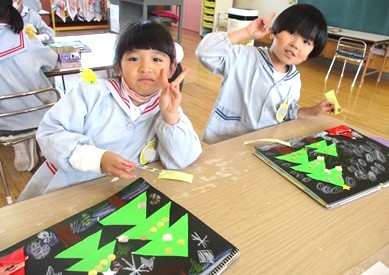 クリスマスツリーにキラキラシールを貼り、