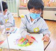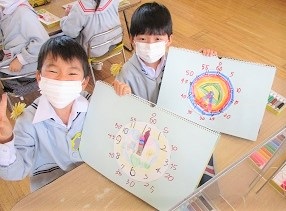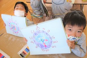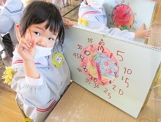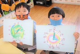 今日は、短い針の読みかたと長い針の読みかたをみんなで覚えて