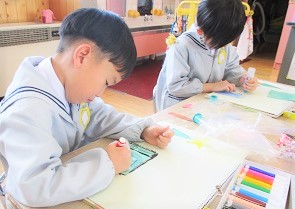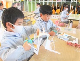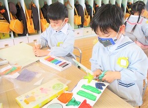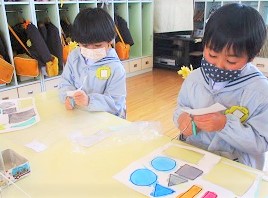 一生懸命考えて絵の具で色を塗った「図形」を製作帳に貼っていき、