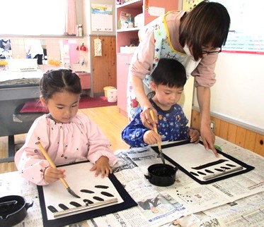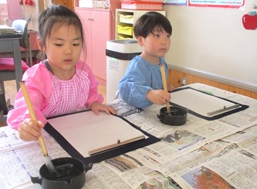 今日の月組さんは、初めてのお習字です。