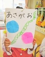 朝顔観察ノートの表紙に飾る ≪あさがお≫を折り紙で作り、