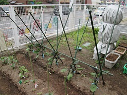 きゅうりとナスに支柱と網がつきました。