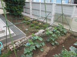この支柱と網は、育っていくきゅうりとナスを支え、大きくなるお手伝いをするものです。