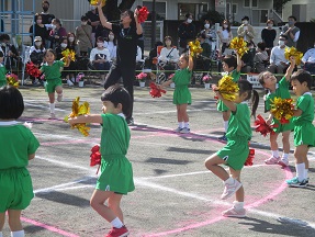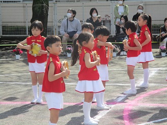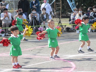 きらきら光る赤とゴールドのポンポンを持って「えがおのまほう」を踊りました♪